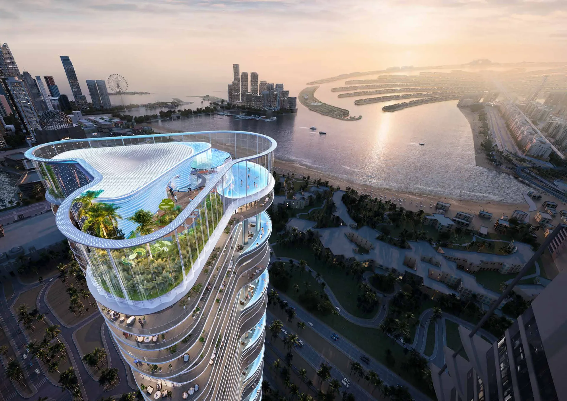 DAMAC Casa by DAMAC Properties is a luxury residential skyscraper project located in the Al Sufouh district of Dubai, designed to combine sophisticated urban living with resort-style experiences just steps from the iconic Palm Jumeirah and Arabian Gulf coast. The 60-storey tower features a mix of 1- to 5-bedroom luxury apartments and townhouses, all crafted with high-end finishes, open-plan layouts, and spacious balconies that offer stunning views of the sea, Palm Jumeirah, Dubai Marina and city skyline. Inspired by aquatic themes, the design incorporates water-inspired architecture and immersive spaces such as an interactive aquarium hall, VR scuba simulator, aqua gym, spa and rooftop artificial beach with cabanas, creating a lifestyle focused on wellness, leisure and panoramic vistas. Residents enjoy a rich suite of amenities – including infinity pools, landscaped gardens, children’s play areas, barbecue decks and high-speed elevators – while being well connected to major business hubs, beaches, dining and entertainment destinations across Dubai. DAMAC Casa aims to offer a unique blend of luxury, creativity and waterfront living in one of the city’s most prestigious neighborhoods.